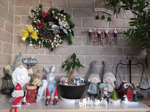 今日の天気は、雨が時々降ったりの変な一日でした。これから天気予報では雪だるまが多く寒さが続くようです!12月もあっという間に10日過ぎてしまいました。クリスマスもあっという間に終わって、正月飾りになりますが、少しでも気分を味わいたいので去年と同じように風除室に飾り付けしました。家にあるもの全員集合ですね(^^) (トップ写真)は金宝樹の脇にじーじが製作した大きなピンクの棚を取り込んでいるので上に板を置いて飾り付けしています。  ↓入って玄関正面脇に今年は「白のポインセチア」、白いのが珍しかったので買ってきました。  手前側に置いてあるものですが別に撮ってみたのが↓アンティークキャンドルスタンドを目立たないですが置いてみました。   玄関の中に飾っているものですが。 ↓去年購入したお気に入りのガラス瓶。花友Kちゃんからのお土産の焼き物も一緒に右側は以前プリザーブドフラワー教室で作ったもの。  ↓毎年登場!20年以上前の年期物『スノーマン』〜♪今年も飾って見ました。  おまけに・・・ もう庭の花も飾るものが無くなり、花ショップポピーさんからお買い得品の花を求めてきました。赤い実の枝物でクリスマスに合うねなんて選んだのですが合う花を探せなくてピンクのバラになりました。これで一本分、350円でお買い得で決めました。枝が硬くカット出来ずに苦労してこんな活け方に…  風除室には大物の金宝樹を取り込んでいるので満杯状態になっています・・・ 玄関は余計な物を置かないで、きれいに掃除しとくべきなんですが、ちょっとだけ我慢してもらって… ばーばの庭遊びも、もう終わりです・・・