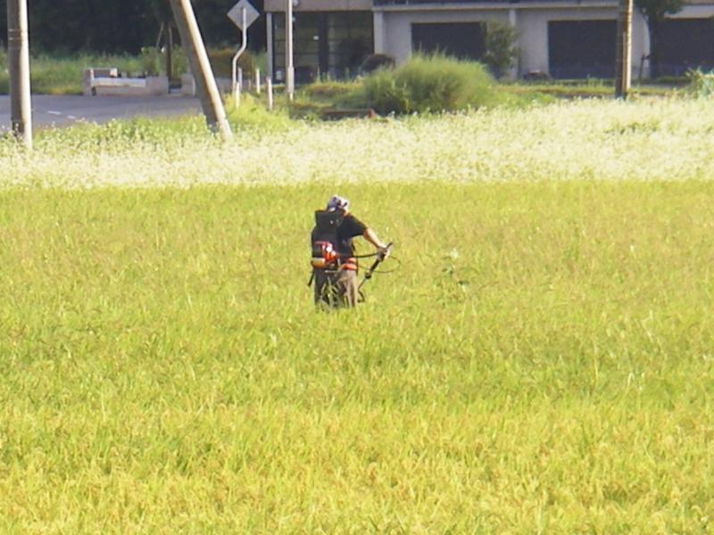 黄金色に実った稲穂と 白く霞む蕎麦の花の中で草を刈っていた