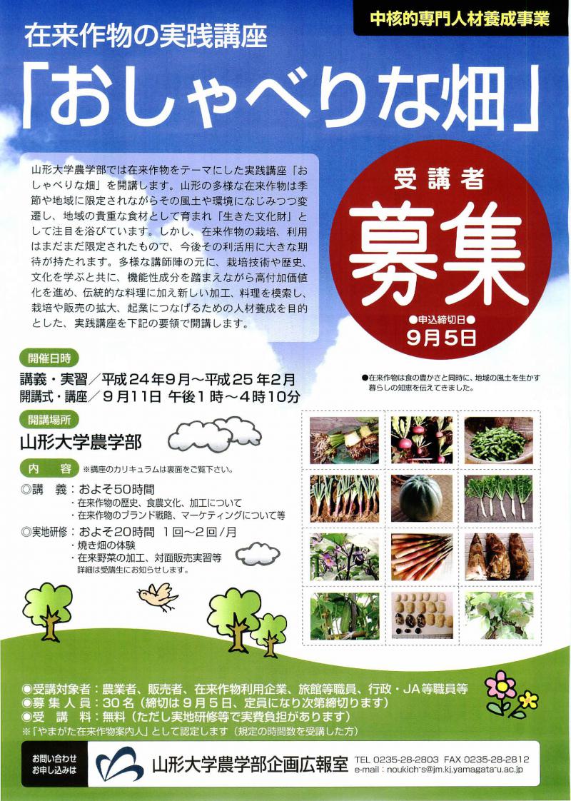 メールでお申し込みの方は、noukich-s@jm.kj.yamagata-u.ac.jp宛に、メール件名を「「おしゃべりな畑」申込」と記載の上、チラシ裏面右下の内容(氏名(ふりがな)、会社名・所属、住所(〒)、電話番号、メールアドレス)を明記してお送りください。9月5日(水)締め切りです。