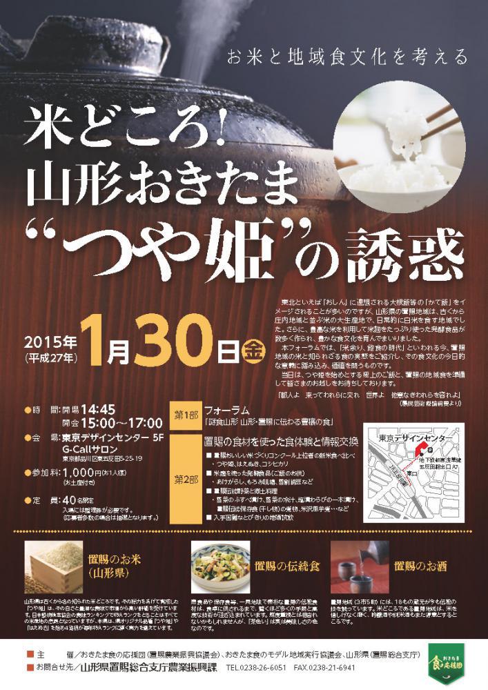 2015年1月30日(金)15:00、東京・五反田の東京デザインセンター5FのG-Callサロンにおいて、山形県が誇るお米「つや姫」と置賜地方の保存食やお酒を紹介するフォーラムと食体験ができるイベントが開催されます。 参加料は1000円で、定員40名(応募者多数の場合は抽選)です。山形在来作物研究会会員は先着5名まで優先確保してくださるそうです。申込書の勤務先・所属団体名称記入欄に、本職とともに「(在作研)」などと記入し、在作研枠ということが分かるように申し込くださいとのことです。