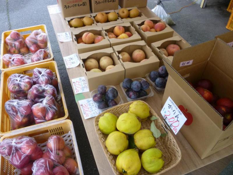 りんご「シナノスイート」「あきばえ」「早生ふじ」、珍しい秋の桃「光月」、すもも「ブラックキング」、かりんなどなどオレンジの屋根特設テントで販売中です。