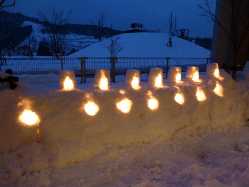 寒さが厳しくなり、雪が深々と降り積もる日々となりました。雪がたくさん積もったので、入居者さんと一緒に雪灯籠を作ることにしました!〜雪灯籠の簡単な作り方〜 @適度な大きさのバケツを用意します。 A雪をギュギュっと詰めます。 Bひっくり返して取り出します。 C横穴をくり抜き中にロウソクを入れたら出来上がりです!出来上がったものを何個か並べ、暗くなってからロウソクに火を灯しました。薄闇の中浮かび上がるロウソクの揺らめく光が、幻想的な雰囲気を感じさせます。入居者の皆さんも、雪灯籠の出来栄えに大変喜んでおりました。