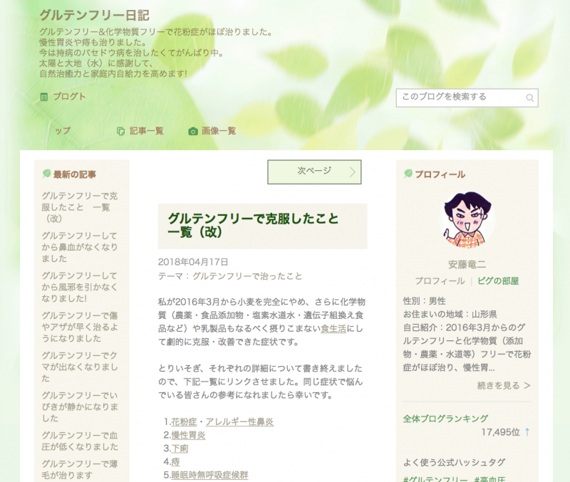 ブログでは改善・治癒した16の症状についてまずは経過報告しています。今後は私の実践している食生活やグルテンフリー情報について書き綴っていこうと思っています。