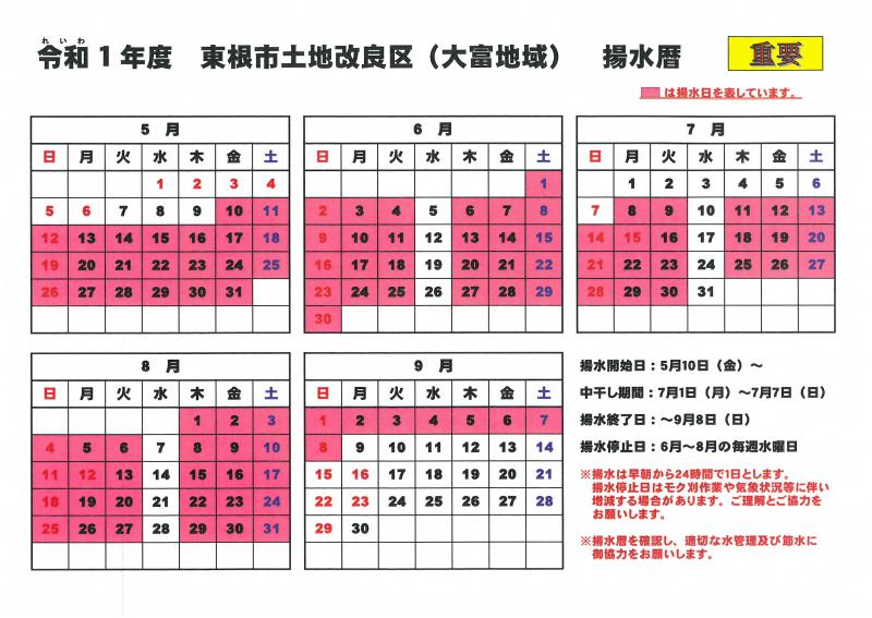 大富地域の令和元年(平成31年)の揚水暦を掲載します。