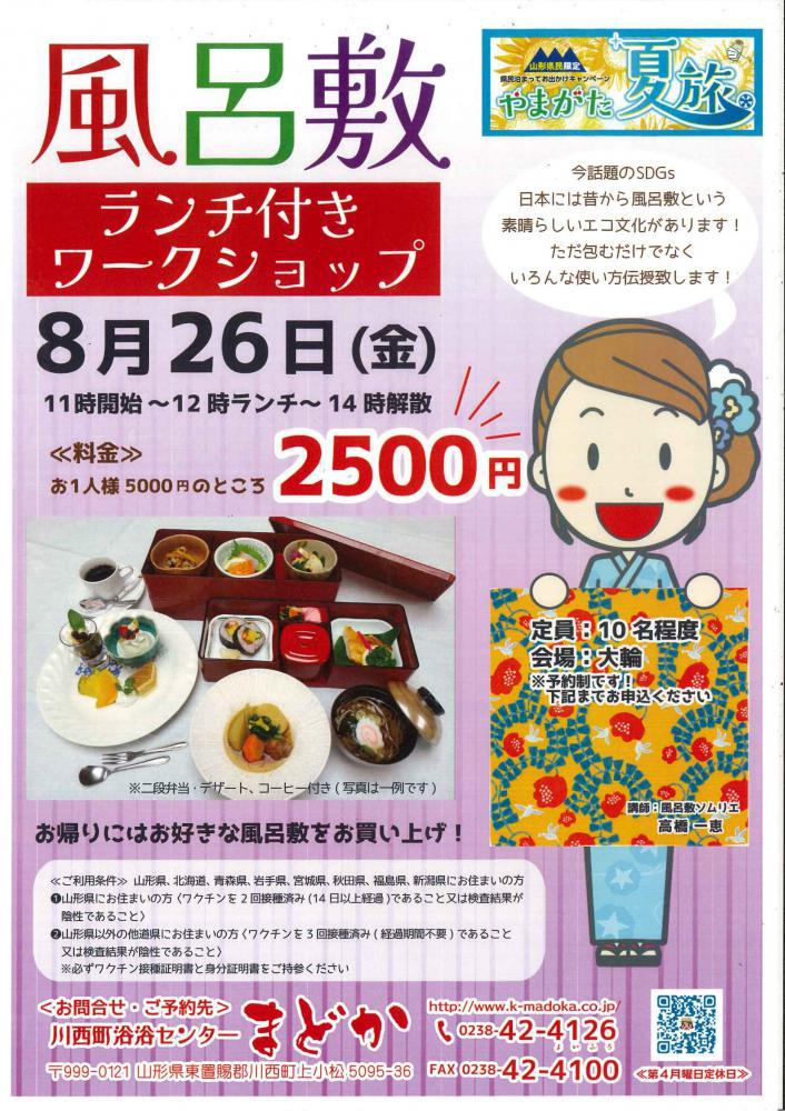 やまがた夏旅キャンペーン企画風呂敷ランチ付きワークショップ8月26日(金)11時開始〜12時ランチ〜14時解散料金 お一人様5000円の所2,500円(二段弁当:デザート:コーヒー付:ワークショップ料金含み)※2000円クーポン付き(お帰りの際にはお好きな風呂敷購入に利用できます)定員:10名程度※ご利用条件と致しまして「やまがた夏旅キャンペーン」利用のためワクチン接種証明と身分証明書持参となります。※予約制です。浴浴センターまどかTEL0238-42-4126までお申込みお待ちいたしております。