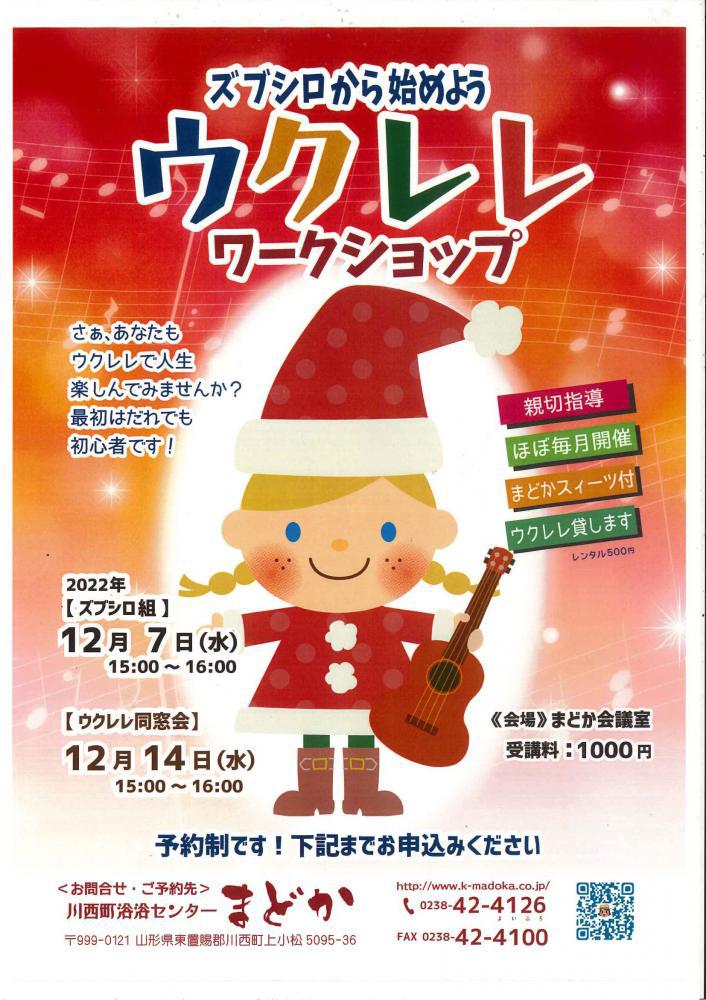 2022.ズブシロから始めよう♪ウクレレワークショップ12月日程 12月7日(水)【ズブシロ組】15:00〜16:00 12月14日(水)【同窓会組】15:00〜16:00※親切指導・ほぼ毎月開催・まどか特製スイーツ付・※希望者ウクレレレンタル有(別料金)※予約制です 0238-42-4126までお申し込み下さい