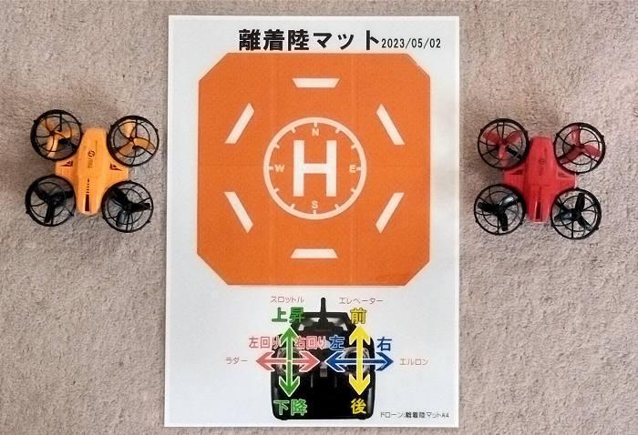ドローン離着陸マットを作ってみました。A4の用紙サイズです。プロポの操作説明もつけました。操作よりも、いまいち「ラダー」だの「エレベーター」だのが、おぼえられないので。というより、覚えようと思わないので。右上の日付は、最初に作成した日付です。