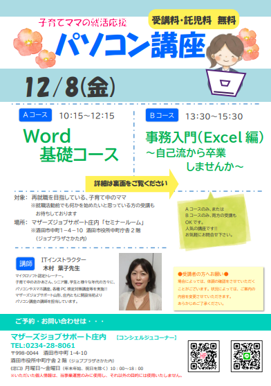 再就職応援『パソコン講座』のお知らせ ◇12月◇≪Aコース≫ 12月8日(金)10:15〜12:15『Word基礎コース』Wordを初めて使う方や、久しぶりの方を対象に基本的な機能と操作方法をお伝えします。表の作成や編集、文章の編集、印刷、表の作成などを行います! ≪Bコース≫ 12月8日(金)13:30〜15:30『事務入門(Excel編) 〜自己流から卒業しませんか〜』事務のお仕事にも、一般・経理・労務など様々です。それぞれどのようなパソコン作業があるのかを確認していきます。実際にエクセルで、関数を利用し請求書を作成します。 ♪片方のコースのみ、両方のコース、どちらの受講でも可能です♪ 【対 象】就職を目指している子育て中のママ※就職活動前で何かを始めたいママもOK【会 場】マザーズジョブサポート庄内 セミナールーム【料 金】受講料 及び 託児料 無料【託 児】 ※事前登録・予約が必要です。保育ルーム開室日【水・木・金】の10:00〜16:00に登録にお越し下さい。 ※併設の保育ルームで、保育スタッフが お子さんをお預かりします。 ママは安心して受講いただけます。 【駐車場について】お車でお越しの際は、中町庁舎脇にあるセントラルホテル契約駐車場をご利用ください。(ジョブプラザさかたと表示してあります。)※契約駐車場が満車の場合は、酒田市中央地下駐車場をご利用ください。無料駐車券(最大2時間)を発行いたします。お帰りの際に、コンシェルジュ窓口へお声がけください。 ★★受講者の皆様へお願い★★場合によっては、体調の確認をさせていただくことがございます。状況によっては、ご案内の変更をさせていただきます。あらかじめご了承ください。★★ーーーーーーーーーーーー★★どうぞ、お気軽にお問い合わせくださいね。 ◇お申込み・お問い合わせ◇マザーズジョブサポート庄内TEL:0234-28-8061メールでのお申込みはコチラ