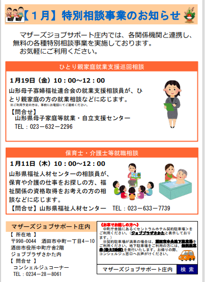 マザーズジョブサポート庄内では、各関係機関と連携し、各種特別相談事業を実施しております。ぜひ、ご利用ください。  保育士・介護士等就職相談 ※お申し込み不要日 時  1月11日(木)10:00〜12:00場 所  マザーズジョブサポート庄内 セミナールーム問合せ  山形県福祉人材センター      пF023-633-7739HP:http://www.ymgt-shakyo.or.jp/jinzai/保育士・介護士・看護師など資格をお持ちの方や、資格取得を目指している方、福祉職にご関心のある方は、お気軽にお越しください。  ひとり親家庭就業支援相談 [要予約]日 時 1月19日(金)10:00〜12:00場 所 マザーズジョブサポート庄内 セミナールーム問合せ 山形県母子家庭等就業・自立支援センター     пF023-632-2296HP:http://www.y-boshi.com/self-support/ひとり親家庭の方や今後について考えている方、どうぞお気軽にご相談ください。 ※各相談会について、利用ご希望の方は、マザーズジョブサポート庄内までお気軽にお声掛けください。※ご相談の際、お子さまの託児は『保育ルーム きらきら』をご利用いただけます。託児ルームのご利用には、事前のご登録が必要です。 【駐車場について】お車でお越しの際は、中町庁舎脇にあるセントラルホテル契約駐車場をご利用ください。(ジョブプラザさかたと表示してあります。)※契約駐車場が満車の場合は、酒田市中央地下駐車場をご利用ください。無料駐車券(最大2時間)を発行いたします。お帰りの際に、コンシェルジュ窓口へお声がけください。 ◇お申込み・お問い合わせ◇マザーズジョブサポート庄内TEL:0234-28-8061メールでのお申込みはコチラ
