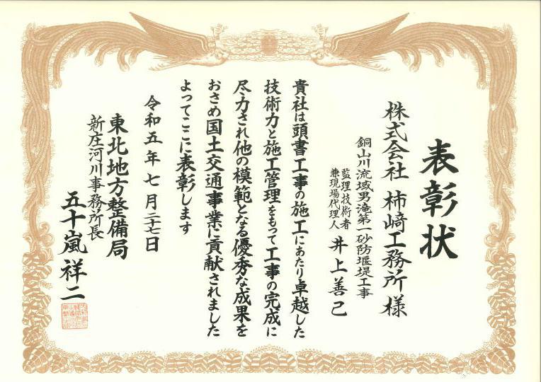 令和5年7月27日に「銅山川流域男滝第一砂防堰堤工事」が、国土交通省東北整備局新庄河川事務所長より優良工事施工者として表彰されました。また、主任技術者兼現場代理人として担当されました「井上 善己」さんが、優良工事技術者として表彰されました。