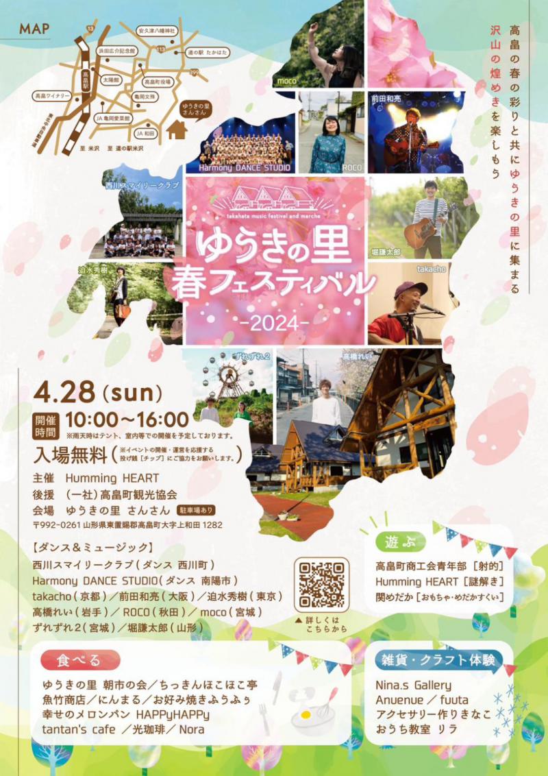 県内外の新進気鋭のアーティストによるミュージックライブを中心に美味しいものや楽しい体験などが集まります!高畠町の春の彩りと共に「ゆうきの里」に集まる沢山の煌めきを楽しもう!入場無料!ぜひ遊びに来てください♪◆開催日:4月28日(日) 午前10時〜午後8時◆場 所:ゆうきの里さんさん      〒992-0261 山形県東置賜郡高畠町上和田1282     Googleマップリンク    ◆内 容・アーティストの紹介などを掲載の特設ページはこちらから(堀謙太郎 anchor Official Website)・Instagramアカウントにてマルシェ出店のご紹介をご覧ください<ダンス&ミュージック>西川マイスリークラブ(ダンス 西川町)Harmony DANCE STUDUO(ダンス 南陽市)takacho(京都)  / 前田和亮(大阪)迫水秀樹(東京) / 高橋れい(岩手)ROCO(秋田)  / moco(宮城)ずれずれ2(宮城)/ 堀謙太郎(山形)<食べる>・ゆうきの里朝市の会(和田地区の特産品)・ちっきんほこほこ亭(唐揚げ、チュロス)・魚竹商店(イカ焼き、日本酒)・にんまる(シフォンケーキ)・お好み焼きふうふぅ(たこ焼き、牛タンつくね)・幸せのメロンパンHAPPyHAPPy(メロンパン)・tantan's cafe(クレープ)・光珈琲(コーヒー)・Nora(ワイン)<雑貨/クラフト体験>・Nina.s Gallery(マクラメ編み雑貨)・Anuenue(ベビー&キッズのヘアアクセサリー)・fuuta(ベビーヘアアイテム)・アクセサリー作りきなこ(アクセサリーワークショップ、販売)・おうち教室 リラ(シュガークラフト)<遊ぶ>・高畠町商工会青年部(射的)・Humming HEART(謎解きゲーム)◆主催 Humming HEART    Instagramはこちらから    Xはこちらから  後援 (一社)高畠町観光協会