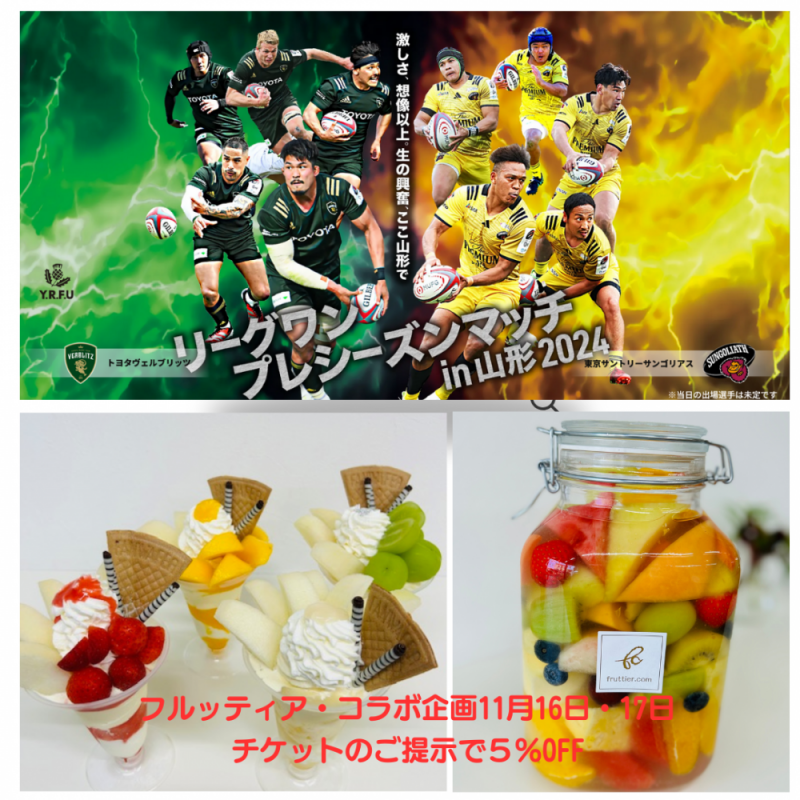 11月16日(土)NDソフトスタジアム(山形県総合運動公園)にてリーグワンプレシーズンマッチ「トヨタヴェルブリッツVS東京サントリーサンゴリアス」が開催されます。そこで山形ラグビー協会様とのコラボ企画!11月16日(土)・17日(日)の両日、チケットのご提示で全品5%OFFとさせていただきます!ラグビー観戦に合わせておいしいフルーツをお楽しみください。ご来店をお待ちしております。