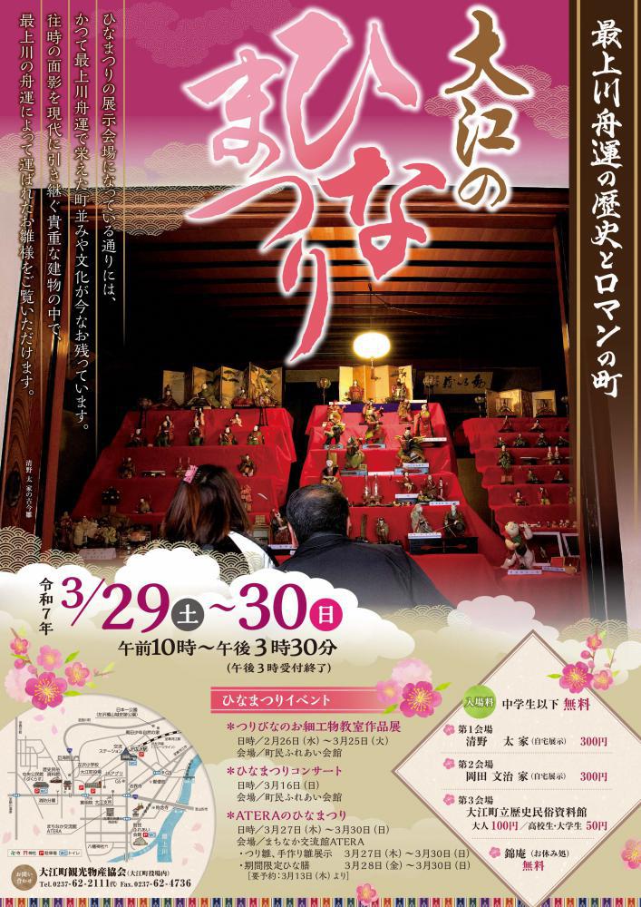 大江町は、最上川舟運の中継地として栄えた歴史を持ち、原町や中央通り商店街の町並みは商家や造り酒屋が建ち並び、今日なお往時の隆盛を物語っております。これらの街並みが平成25年3月に風景の国宝ともいわれる国の重要文化的景観に選定されました。ひなまつり期間中は貴重な建物の中でお雛様を見ることができ、舟運時代の繁栄ぶりを偲ぶことができます。【開催日】令和7年3月29日(土)、30日(日) イベント内容≪お雛様の展示≫展示会場@町内個人宅(清野家、岡田家)受付時間:午前10時〜午後3時(午後3時30分終了)料  金:各会場300円、中学生以下無料A大江町立歴史民俗資料館受付時間:午前10時〜午後3時(午後3時30分終了)料  金:大人100円、学生50円、中学生以下無料Bお休み処 錦庵受付時間:午前10時〜午後3時(午後3時30分終了)料  金:無料あたたかい甘酒のふるまいがあります。≪うちのお雛さま見でけらっしゃい≫ 町内協力店舗によるお雛様の展示(予定)時 間:各店舗営業時間内料 金:無料協力店舗:割烹きくや、御菓子処蝶谷、山十呉服店、廣野屋呉服店、アンドウ洋品店、銘菓処藤岡屋、クスリのいちきゅう、林武一郎商店、ヘアーサロン・カメトコ、洋服のクローバー、藤島屋菓子店、鈴木米穀店、菊地写真館、菓房かしくら、テルメ柏陵、まちなか交流館≪中学生以下限定!お菓子プレゼント≫雛展示会場(町内個人宅2会場、資料館、お休み処錦庵)の4カ所で、中学生以下のお子さんに町内菓子店の銘菓をそれぞれ1個ずつプレゼントします。各会場でお菓子は違いますので、全ての会場を回って4種類のお菓子をGETしよう!
