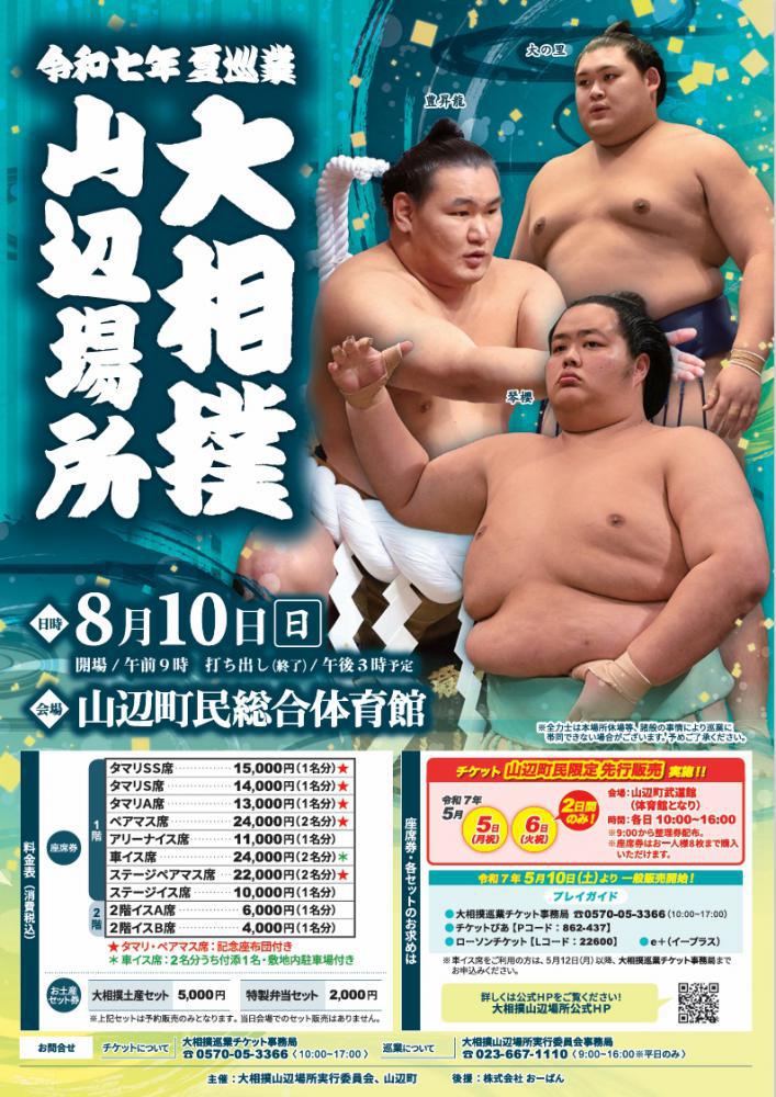 令和7年夏巡業 大相撲山辺場所 開催のお知らせ山辺町では、幅広い世代から人気のある相撲巡業を通して、町の賑わい創出と地域活性化、交流人口の拡大等を図るために、「令和7年夏巡業 大相撲山辺場所」を開催いたします!山辺町では初の大相撲巡業!皆さんから楽しんでいただけますよう、各団体と連携して取り組んでいきます。開催概要開催日:令和7年8月10日(日曜日)開場:9:00 / 打ち出し(終了予定):15:00場所:山辺町民総合体育館チケット販売について● 山辺町民限定先行販売 日程:令和7年5月5日(月・祝)、6日(火・祝) 各日10:00〜16:00(9:00より整理券配布) 会場:山辺町武道館 ※座席券はお一人様8枚まで購入可能● 一般販売 販売開始:令和7年5月10日(土曜日) お電話:0570-05-3366(10:00〜17:00/大相撲巡業チケット事務局) ※車イス席をご利用の方は、5月12日(月)以降に事務局へお申し込みください。その他、チケットぴあ、ローソンチケット、e+(イープラス)での購入等、詳細については公式HPをご覧ください。公式ページを見る