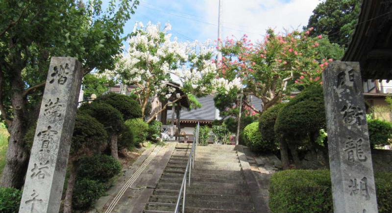 ●8月1日は南陽市名誉市民結城豊太郎先生の命日です 結城豊太郎記念館友の会では毎年東正寺の墓前で「墓前祭」を行っています 昨日よりは涼しさを感じる今朝東正寺で墓前祭に参列してきました 毎年この季節に本堂前の石段の両側に白とピンクのサルスベリが咲いています 暑い夏の季節を迎えるとサルスベリを思い出します