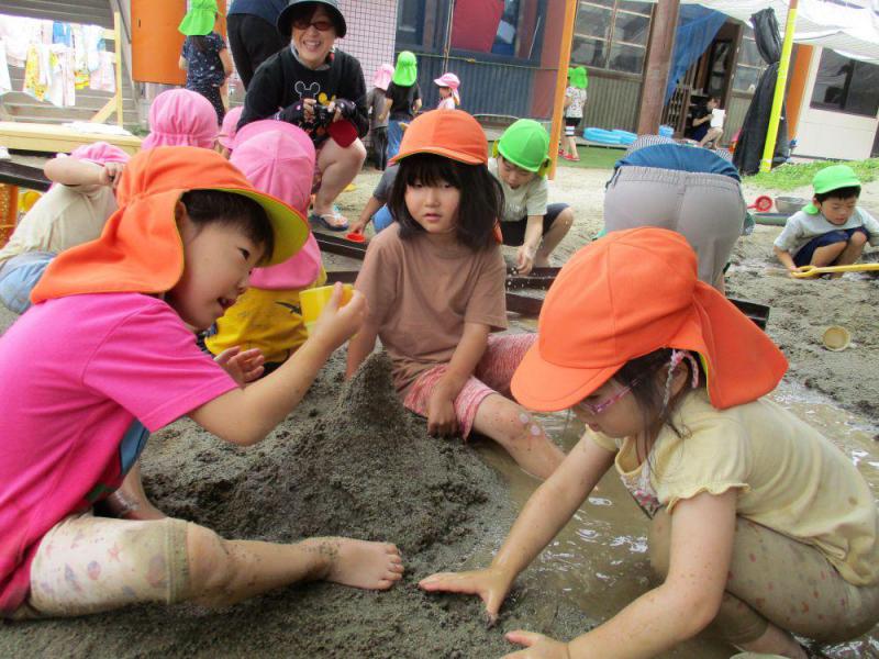気温が高くなりすぎない日に、夏ならではの水を使ってのダイナミックな遊びを楽しみました。どろんこ遊びを楽しみにしている子や、泡や花をつぶして色水を作っておままごとをする子と楽しみ方は様々です。また、氷絵の具を作り青空の下でのお絵描きはみんな興味津々でした。