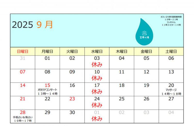 今月の営業カレンダーです。大人気のマッサージと手相占いのほかに、オカリナコンサートがありますので、ぜひ、遊びにいらしてください。9月もがんばっていきます〜